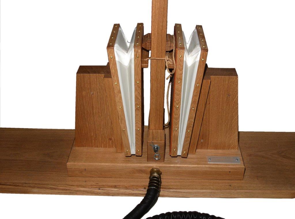 Balg 19 x 38 cm Innenmaße, Hebellänge 98cm. Bodenplatte 36 x 160 cm. Alle Holzteile aus Eiche.