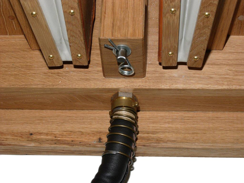 Das der Druck relativ schnell zurückgeht liegt vermutlich an der schlechten Dichtwirkung der Lederklappen auf dem Holz. Bei dem geringen Pumpvolumen hätten es bestimmt auch weniger getan. Bei meinem Versuchsbalg hatte ich dort einen leicht herausstehenden Messingring eingebaut. Wenn man nicht nur dem Helmventil vertrauen will könnte man am Ausgang des Balges noch ein wirklich dichtes Rückschlagventil hinzufügen.