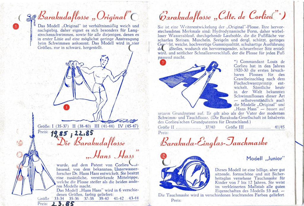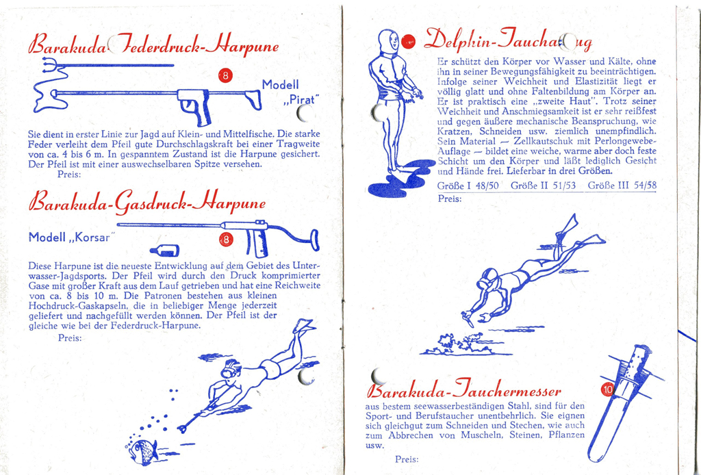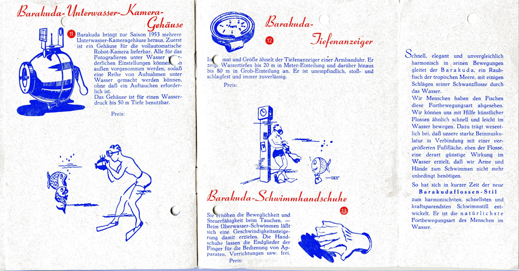 Von Franz weiß ich, dass er einige BARAKUDA-Kataloge besitzt. Ich selber habe z.B. ein Tarierjacket, den legendären Baramat, ein schwimmfähiges Taucher-Messer mit monströsem rot/gelben Griff, Tiefenmesser und einige PTG mit Trageschalen. Da gab es jedoch vieeeeeel mehr, was BARAKUDA unter eigenem oder fremden Label vertrieben hat.