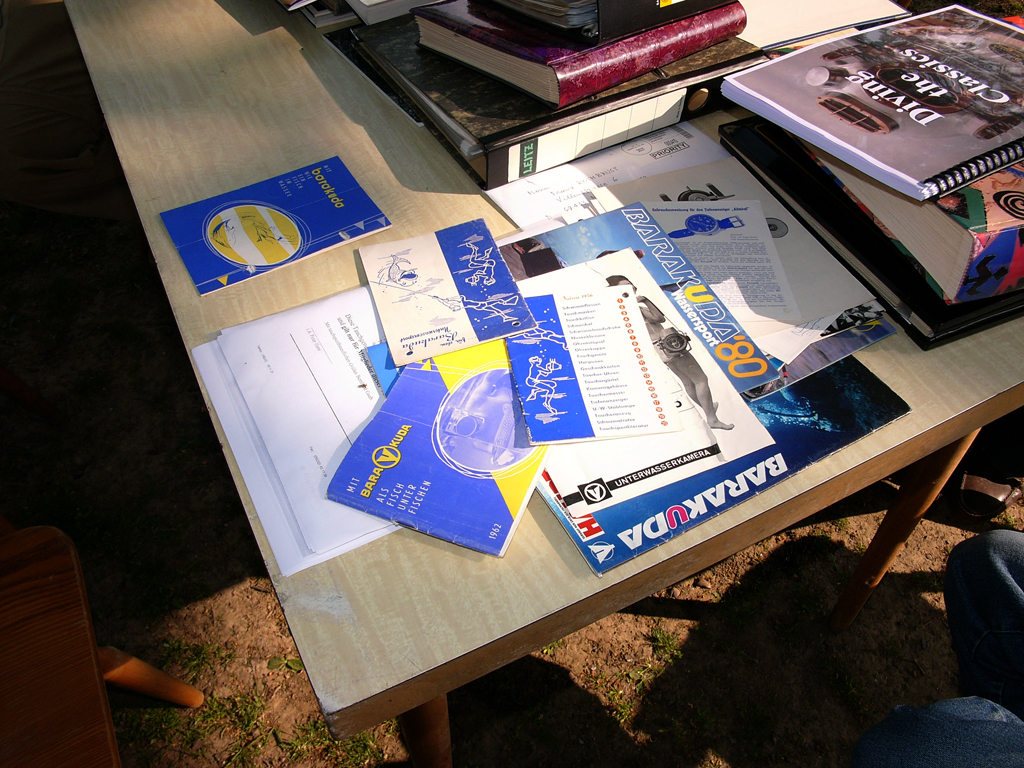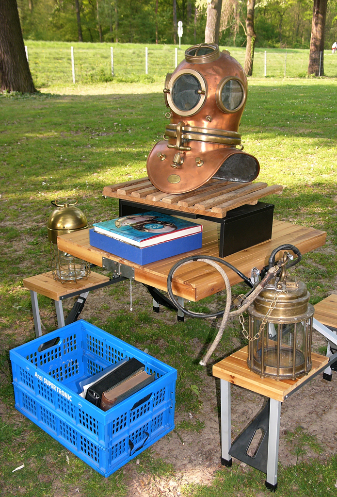 Am gestrigen sonnigen Sonntag versammelten wir uns zum Frühjahrstreffen "Süd" am Lingenfelder Badesee. Dreizehn Teilnehmer waren angereist. Den weitesten Weg hatte Wolfgang Friebe, er brachte zwei Bergungstaucher- Kollegen vom Technischen Hilfswerk Aachen mit in die Pfalz. Rolf Vötsch breitete Schätze aus seiner Literatursammlung auf einem der Tische aus. Ob dünner Prospekt oder dicker Wälzer, alles wurde ausgiebig durchgeblättert und diskutiert. Pierre Meyer präsentierte seinen französischen "Charles Petit" Taucherhelm. Das schöne Stück wurde um 1900 gebaut und ist sehr selten. Er hat keine Bolzen und wird über einen Schnappverschluß auf dem Schulterstück gehalten. Einige Zaungäste, teilweise sehr fachkundig, stellten Fragen zu den ausgestellten Geräten. Zwei Mitgliedsanträge wurden angefordert. Michael Kalb aus Offenbach an der Queich ist seit gestern Mitglied in unserem Verein.