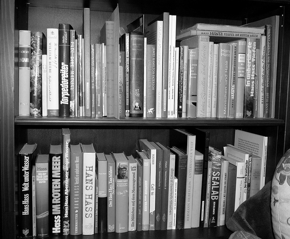 Wie kommt nun Hans Hass ins Spiel? Na ja, für Taucher, die mit Hans Hass groß wurden, der Testfall, ob Tauchbuchliebhaber oder nicht. Der Herausgeber wenigstens denkt, je eines seiner Bücher gehört schon in die Büchersammlung. Auch wenn man darin nicht mehr liest. Haben und irgendwie Gedenken ist alles. Man muss es ja nicht so weit treiben, auch die verschieden Ausgaben oder Auflagen zu sammeln („Unter Korallen und Haien“ beispielsweise wurde von 1941 in kriegsbedingter mieser Papierqualität im Deutschen Verlag, Berlin, bis 1977 bei Bertelsmann, München, immer mal wieder neu aufgelegt) oder gar die entsprechenden Übersetzungen. Egal vielleicht auch der Erhaltungszustand, ob Erstausgabe, signiert, vorhandener Schutzumschlag oder was auch immer. Nun, dem Herausgeber ist das wenigstens mit den Büchern der Familie Hans Hass gelungen: Bis auf eine unerreichbare Ausnahme, die er sich nicht einmal an-sehen konnte: Hass, Hans: Fische und Korallen. Singen-Hohentwiehl: Aluminium Walzwerke Singen GmbH, 1958 [Kalender, Sonderdruck einer Auflage von 100 Expl. auf kaschierter Aluminiumfolie].