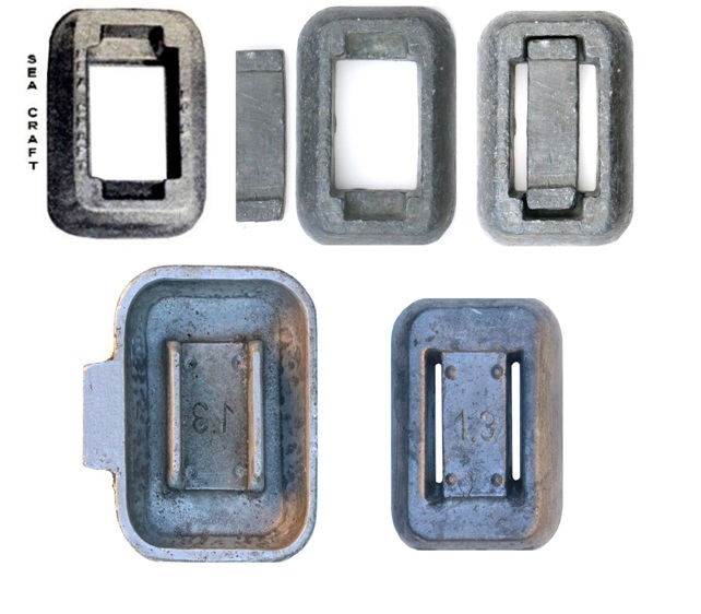 Die Gußform stammt aus den USA (sichtbar die Bezeichnung SEA CRAFT)und wurde vielmals kopiert. Leider waren die Öffnungen sehr groß und beim Ablegen des Gewichtsgurtes löste sich öfter der Mittelsteg und man mußte wieder die Gewichte neu einsetzen. Es wurden der Mittelsteg an das Hauptgewicht angelötet, denn man brauchte nicht alle Gewichte lösbar zu haben. Später wurde dann daraus eine einteilige Form und die Gurtöffnungen in der Höhe verkleinert, so dass auch keine Gurtstopper nötig waren.
