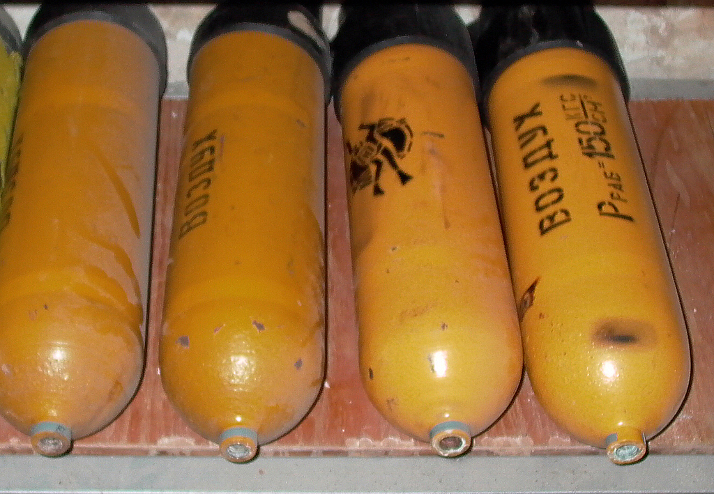 Im Gerät selbst wurden 2x 5l Flaschen mit je 200 bar verbaut, die dann über einen Druckminderer ("1. Stufe") und eine Rohrleitung die zweite Stufe speisen: