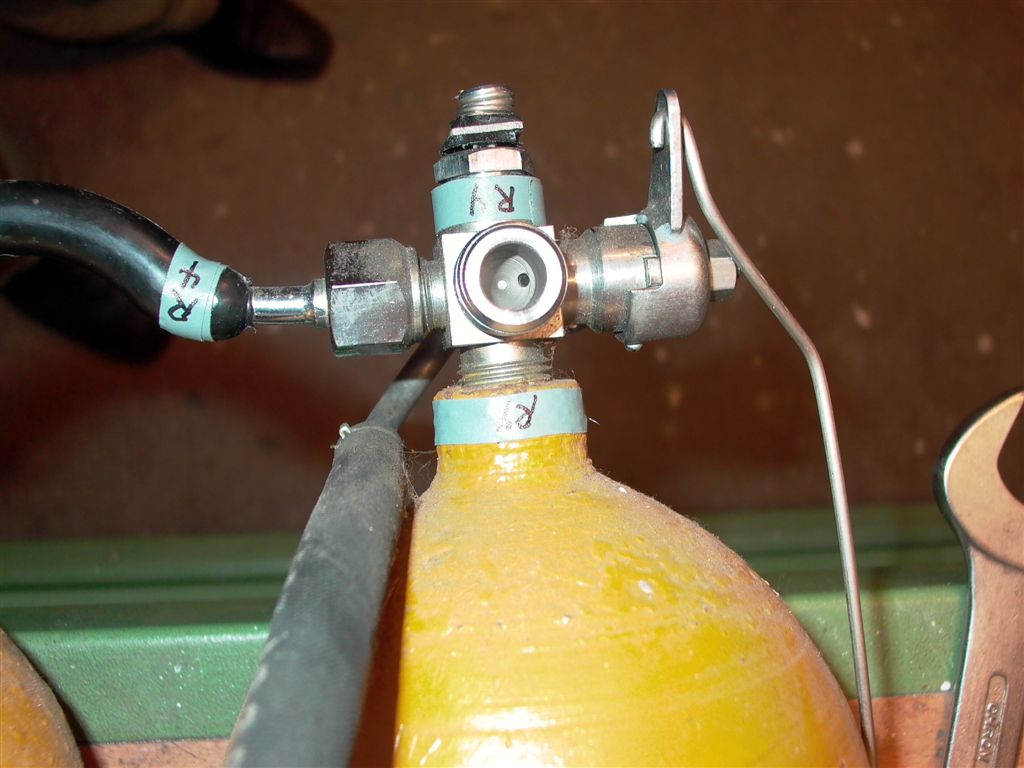 Im Gerät selbst wurden 2x 5l Flaschen mit je 200 bar verbaut, die dann über einen Druckminderer ("1. Stufe") und eine Rohrleitung die zweite Stufe speisen: