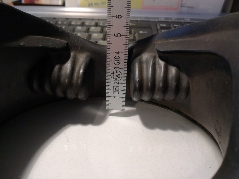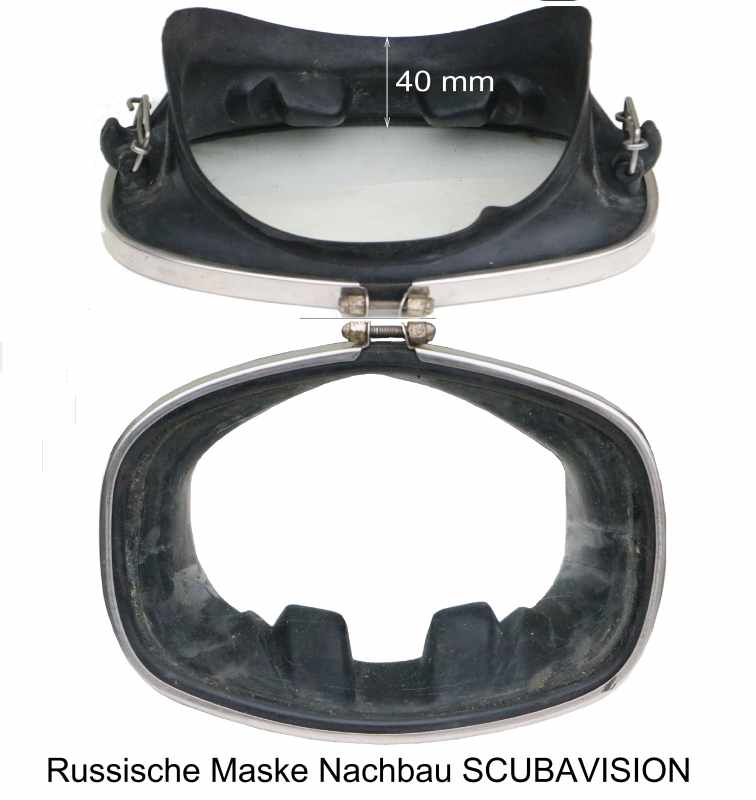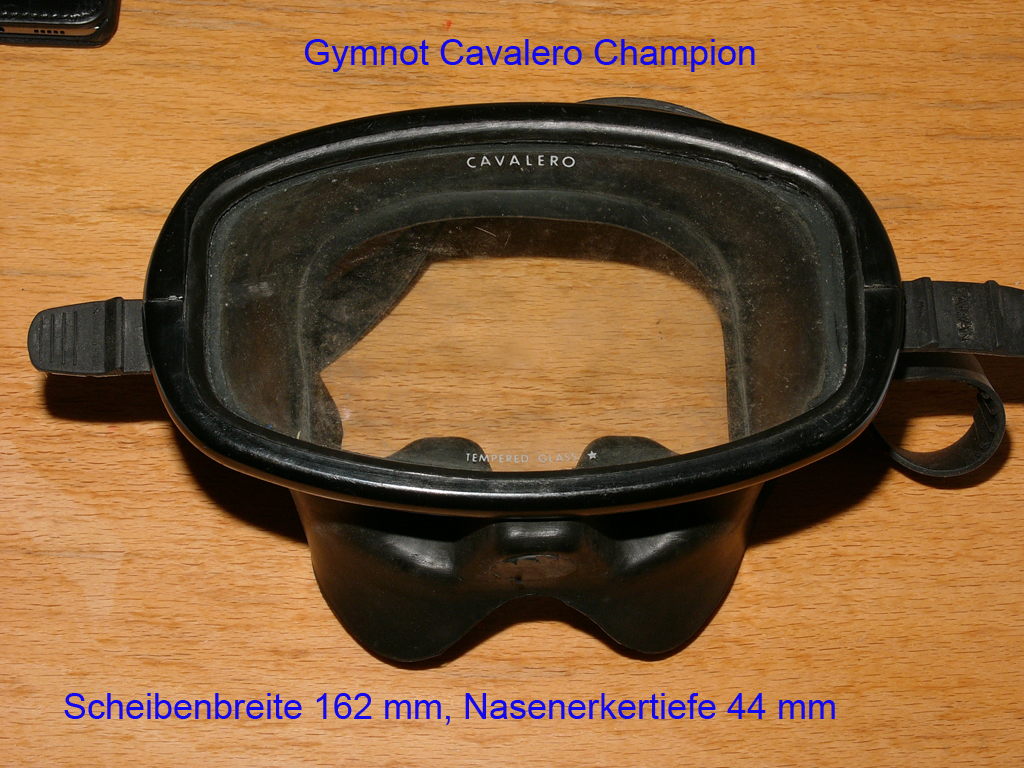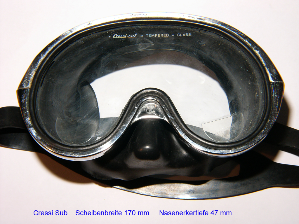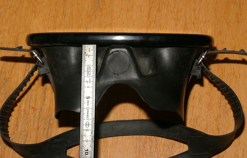 Ein weiteres wichtiges Maß ist die Scheibenbreite, wenn man einen großen Kopf hat. Es ist schwer Masken zu finden, die etwas breiter sind. Der Totraum ist mir schnuppe, ich tauche um etwas zu sehen und nicht mit der Luft zu geizen. Die einzige moderne Maske, die mir wirklich passt, ist die "Visualator" von TUSA.