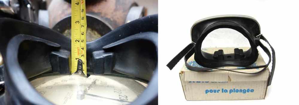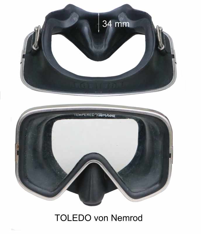 Ein weiteres wichtiges Maß ist die Scheibenbreite, wenn man einen großen Kopf hat. Es ist schwer Masken zu finden, die etwas breiter sind. Der Totraum ist mir schnuppe, ich tauche um etwas zu sehen und nicht mit der Luft zu geizen. Die einzige moderne Maske, die mir wirklich passt, ist die "Visualator" von TUSA.