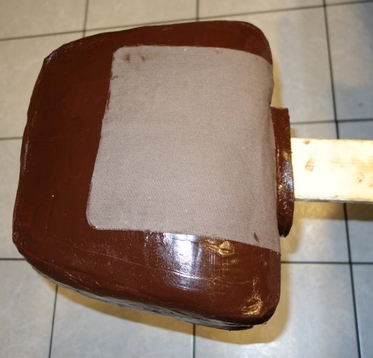 Um die Beschichtung auftragen zu können musste der Atembeutel von innen abgestützt und gespannt werden. Wir wählten dazu auf Form geschnittene Schaumgummiteile. Damit die Beschichtung in einem Schritt erfolgen konnte musste zusätzlich eine Holzhalterung gebaut werden, die eine Fixierung des Beutels in verschiedenen Lagen gestattete ohne bereits beschichtete Flächen zu berühren.